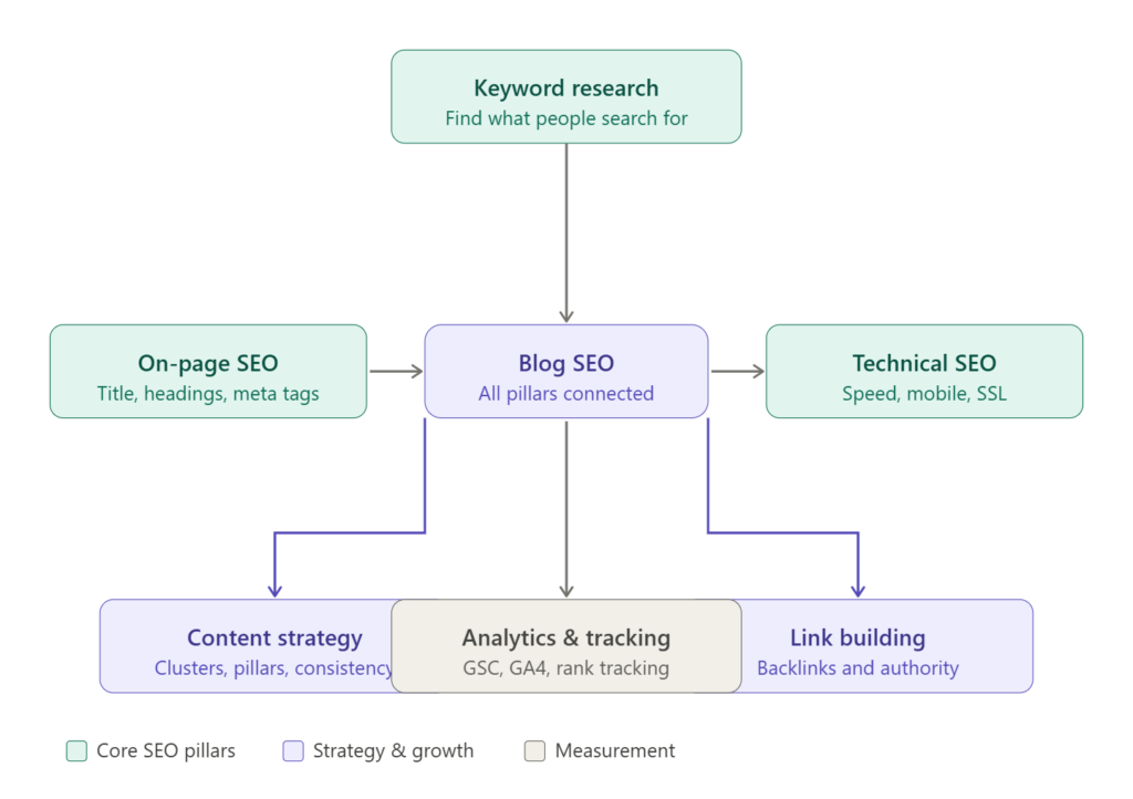 Blog SEO is the practice of optimizing your blog posts so they rank higher in search engine results pages (SERPs). It involves choosing the right keywords, structuring your content clearly, improving your site’s technical health, and earning links from other websites. Done consistently, blog SEO drives free, sustainable organic traffic to your blog.